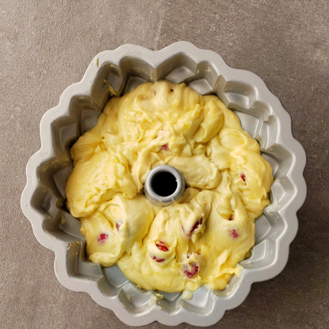 Preheat the oven to the temperature indicated on the box. Grease the Bundt pan liberally and set aside. Coat the raspberries in the flour and set aside.